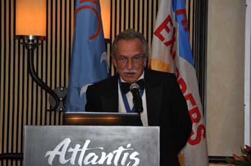 On Friday evening, after a break, Consociates had the option (which most took) to attend the annual banquet of the Andean Exploration Foundation and Ocean Sailing Club, held at the Atlantis Hotel’s Paradise Room. The evening included a bagpipe memorial tribute to members who had died; slide presentations of Project X expeditions to South Africa, Zimbabwe, Korea, and Japan; and the awarding of medals of participation and support for foundation members. During the meal, attendees were treated to Indian sarod music and Japanese traditional dance.