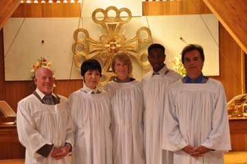 Saturday was a full day, beginning with Communion Service in the Chapel of the Holy Child at 10 a.m., followed by first- and second-degree ordinations in bishop’s chambers, followed by a reception in the vestibule. Lee Ann Baum, Frank Gadsen, Humberto Garcia, Scott Ripke, and Saeno Tokuaga received first-degree ordination, while John Bowd (who, in his seventies traveled from Australia), was ordained a deacon (second-degree ordination).