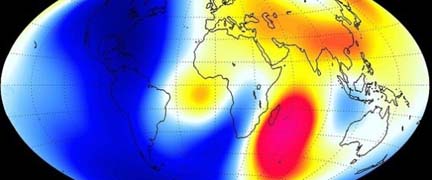 Changes measured by the Swarm satellite over the past 6 months shows that Earth’s magnetic field is changing. Shades of red show areas where it is strengthening, and shades of blue show areas that are weakening. PHOTO: ESA/DTU