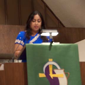 Radheka Patel reads from Hindu scripture in Hindi. PHOTO: Rebecca Willis