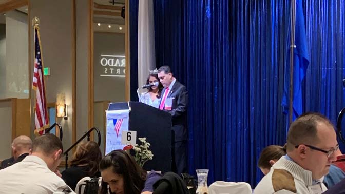 Gene Savoy Jr. giving the invocation at the VOA “Shelter from the Storm Breakfast” beside Nasya Mancini, Miss Nevada 2019.