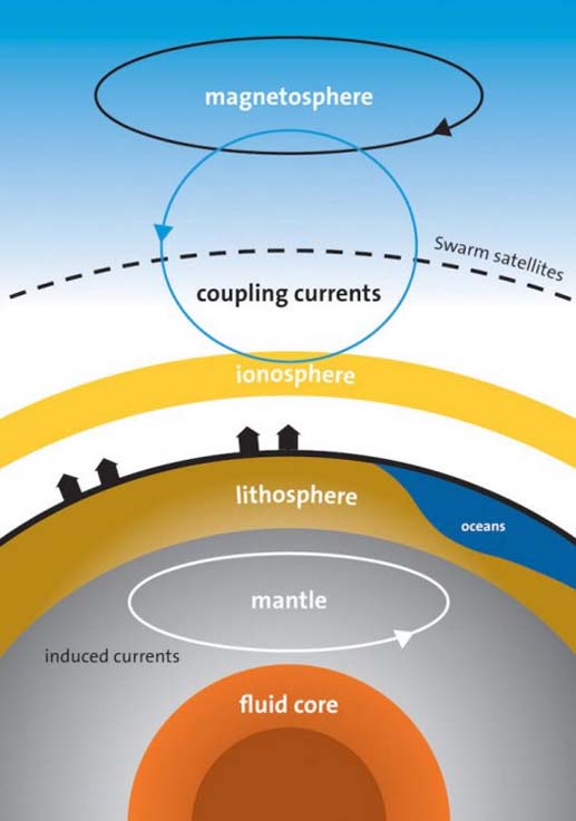 “So far, Swarm data indicates that ocean water forms an electric current that, in turn, induces electromagnetic feedback in the mantle, a region between 30 kilometers deep under the continents and 5 kilometers below the ocean floor. Although the effect is small, it contributes to Earth’s overall intrinsic fields. An important note is that the electric charge flow is induced by coupling with the magnetosphere.”