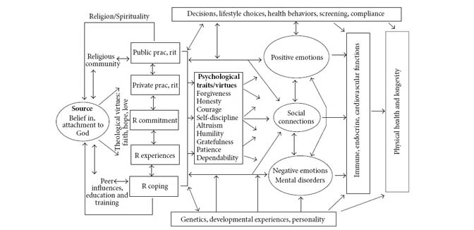Theoretical model of causal pathways to physical health for Western monotheistic religions (Christianity, Islam, and Judaism). Original source: Koenig et al.